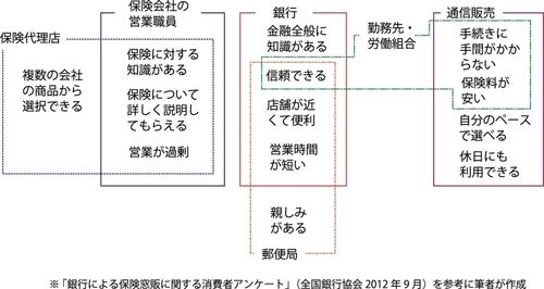銀行による保険販売(2)はこちら (2) 営業チャネルの特性 全銀協の報告書では、チャネルのイメージもかなり正確に報告されていると思います。この報告書では、銀行、保険会社の営業職員、保険会社の通信販売、郵便局、保険代理店の窓口・営業職員、勤務先…