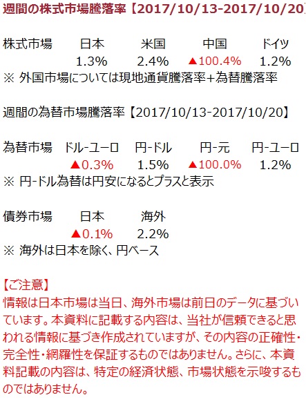 米国ではトランプ大統領がタカ派のスタンフォード大のジョンテイラー氏を次期FRB議長にすると予想されておりダウは一時23000を超えた。上院でオバマケアに対する折衷案が示されヘルスケア関連が上昇。IBMやジョンソン&ジョンソンが値を上げ、ゴールドマンサックスやNetflixが値を下げた。欧州では中国での需要が堅調なダノンや教育関連のピアソンなどが値を上げたが市場全体としては値下がり
