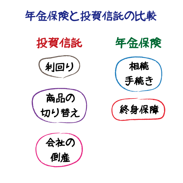 その他、ほかの商品に切り替えたいときに容易に切り替えることができるか(スイッチング機能)や、運用している会社が破たんしたときに資産が保全されるのかという点では投資信託に軍配が上がります。